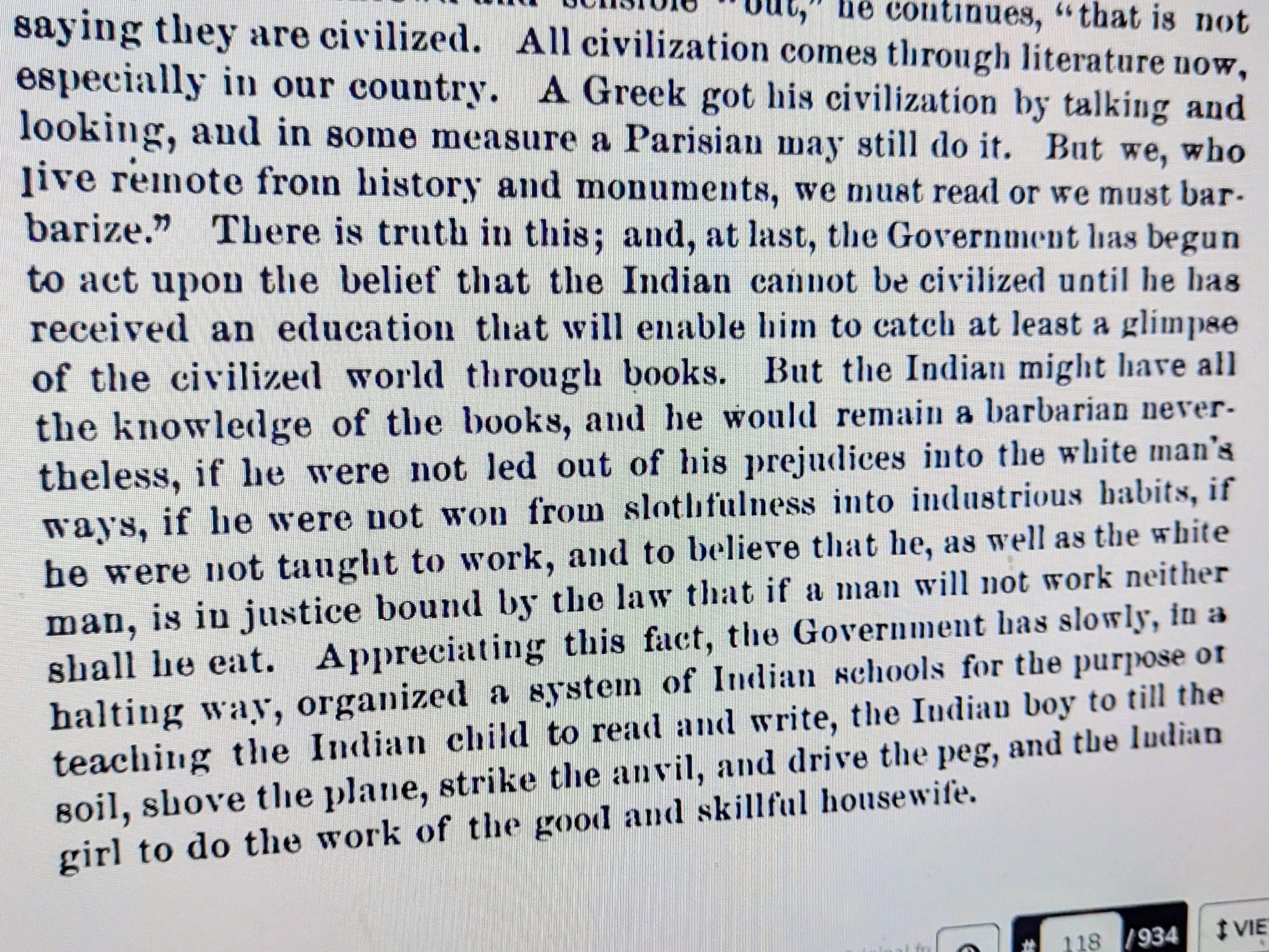 “But the Indian might have all the knowledge of the books, and he would remain a barbarian nevertheless, if he were not led out of his prejudices into the white man’s ways, if he were not won from slothfulness into industrious habits, if he were not taught to work, and to believe that he, as well as th white man, is in justice bound by the law that if a man will not work neither shall he eat. Appreciating this fact, the Government has slowly, in a halting way, organized a system of Indian schools for the purpose of teaching an Indian child to read and write, the Indian boy to till the soil, shove the plane, strike the anvil, and drive the peg, and the Indian girl to do the work of the good and skillful housewife.” (page CVIII)